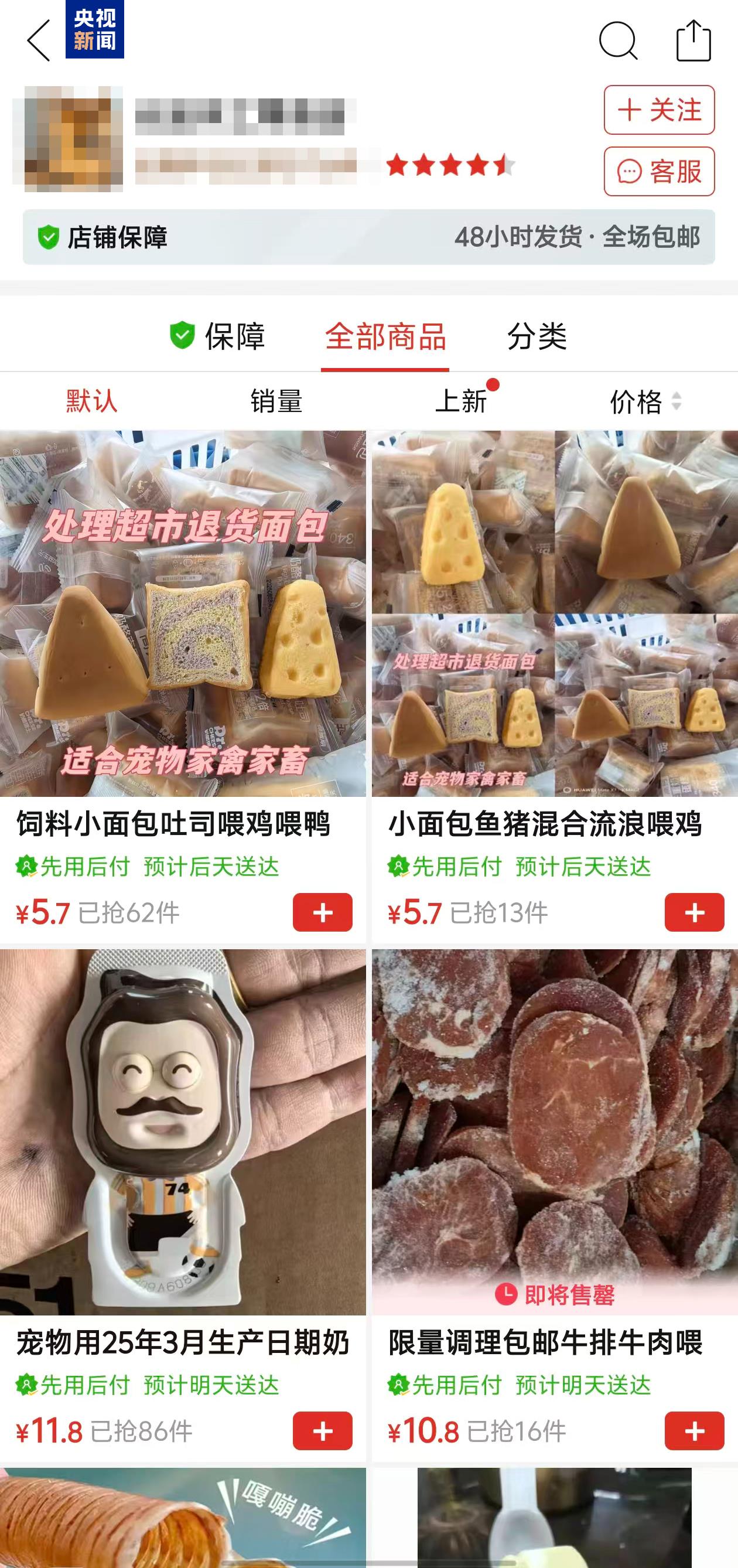 正在某电商平台一家店肆内,这里售卖各类动物饲料、“平替”面包、糕点以及超市下架的各品牌进口饼干等等。记者设法联系上了该店肆的担任人,一位名叫“春风”的商家正在德律风中引见,他们批发售卖各类过时食物,包罗面包、腊肠、烧鸡、零食等等,把这些过时食物当做宠物食物卖,仅仅是此中的很小一部门。“春风”商家:对,肉类跟面包类的纷歧样,好日期的价钱和过时的价钱也纷歧样。以面包来说,糕点类的差不多发货价合到1800元一吨。“春风”商家:对,若是里边加点什么辣便条、膨化食物、魔芋那些参差不齐的小零食,加散碎的工具就廉价了,合到1500一吨。